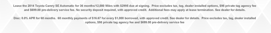 We are offering some of the lowest prices of the summer so you can drive a new 2014 Camry SE for the price of a Corolla.